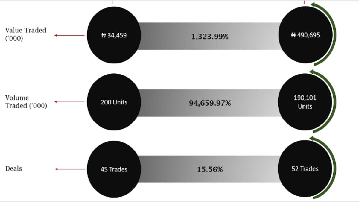 Further insight indicates that there was a 1323.99% increase in the total value traded during the week, according to traders. Investors traded a total of ₦ 490,695,423.17 in value compared to ₦ 34,459,169.50 in the previous week. Hence, the total trade activity for the year inched to ₦ 26,526,412,221.69.
